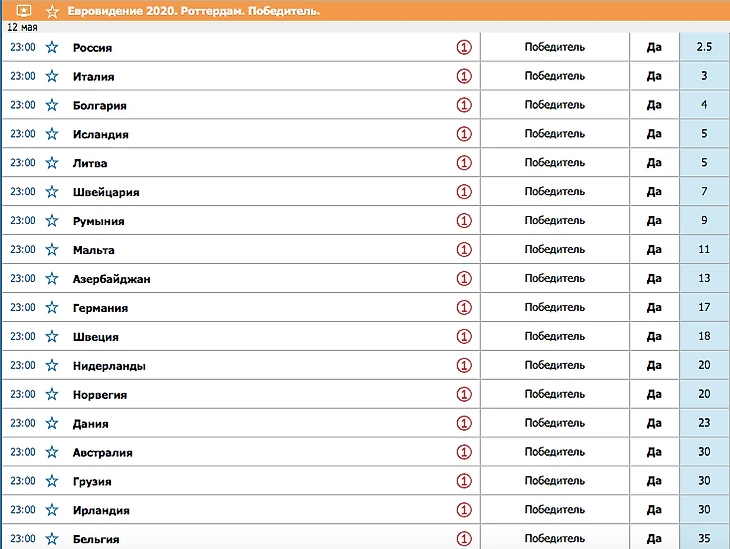 15:00 Евровидение тоже отменен на этот год. Вроде как отобранные артисты будут выступать уже в следующем году. Котировки накануне отмены были следующими. Вот линия Бетсити.