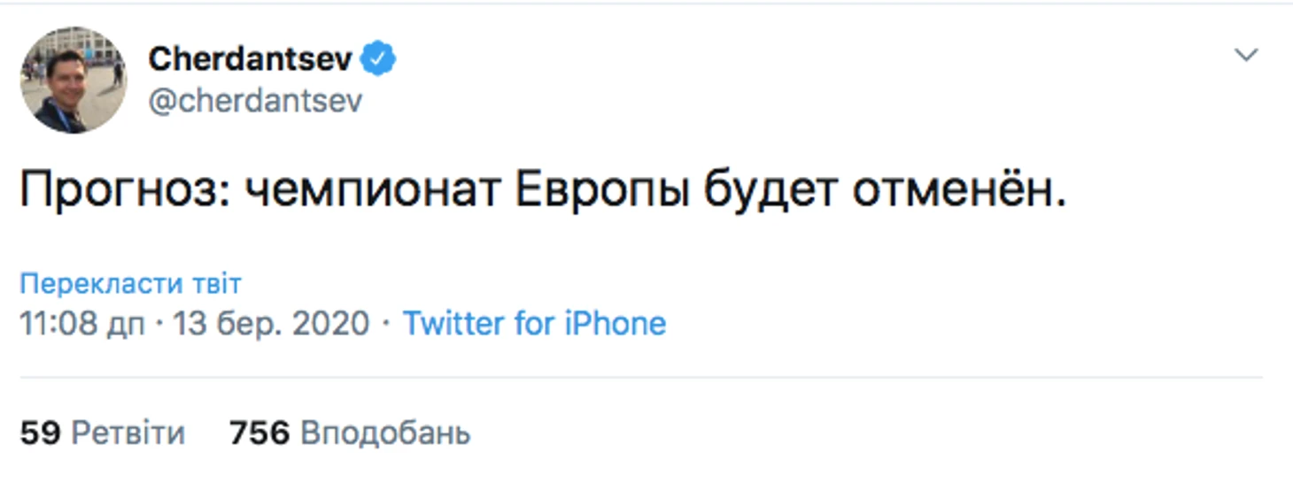 По последним данным СМИ, УЕФА всерьёз рассматривает возможность переноса чемпионата Европы на лето 2021 года. Евро-2020 должен начаться 10 июня.