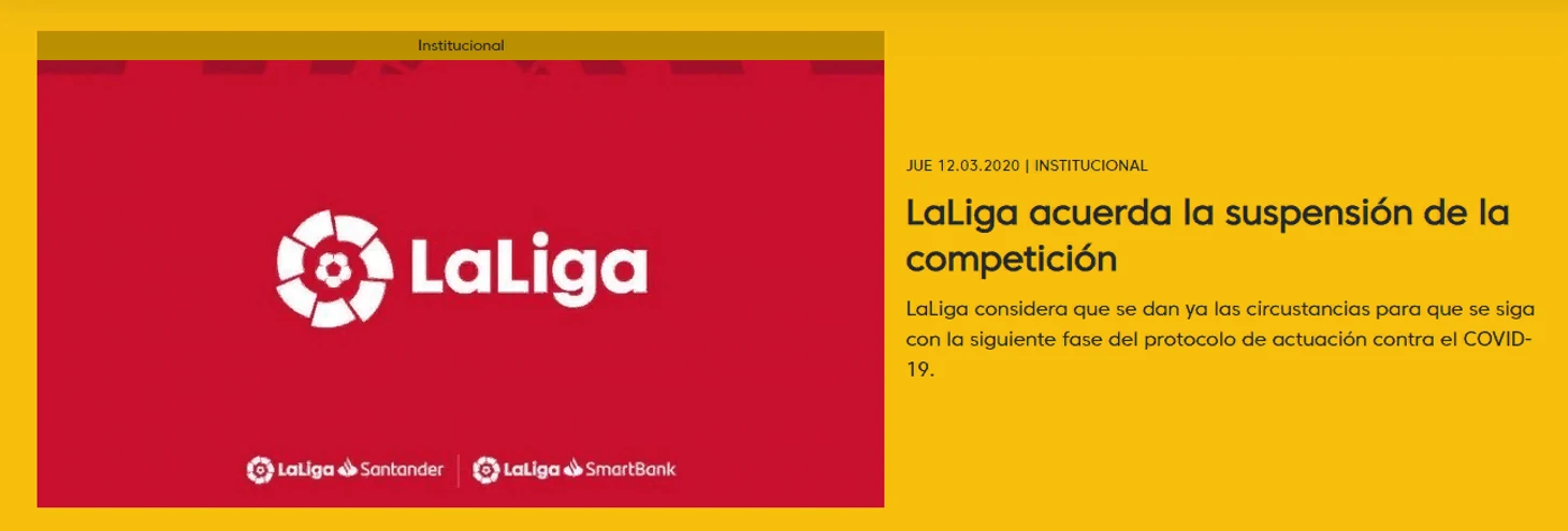 15:00 Ла Лига приняла решение приостановить чемпионат Испании из-за распространения коронавируса. Турнир будет остановлен как минимум на два ближайших тура. Решение было принято из-за введения карантина в «Реале», а также из-за возможного заражения игроков других клубов.