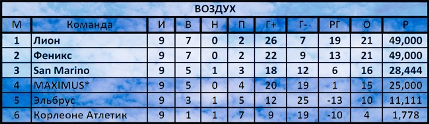 Команды Воздуха были явно сильнее. Из шести матчей представителям Огня удалось выиграть всего один. MAXIMUS, Феникс и Лион поддержали реноме своей группы. Эйфория отдувалась за весь огонь, как могла. 3:1, уверенная общая победа дивизиона Воздух.