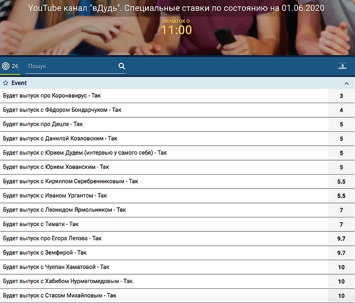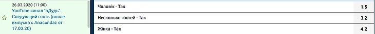 В практически полном отсутствии спорта остаются неспортивные темы на которые можно поставить. Каждый день букмекеры добавляют что-то новое. Все знают популярный канал на ютубе "вДудь". Сейчас можно поставить на его гостя и/или тему.