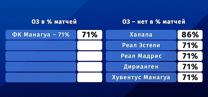 Отметим, что «Халапа» и тут отличилась, выдав всего одну игру с голами обеих сторон. Также в список вошли команды с такими названиями, как «Реал Мадрис» и «Хувентус Манагуа». Не обошлось без «Дириангена» и победителя Апертуры – «Реала Эстели». Таким образом, есть два клуба с яркими трендами: «Халапа» и «Дирианген».