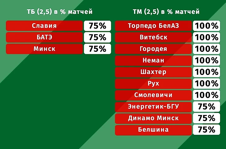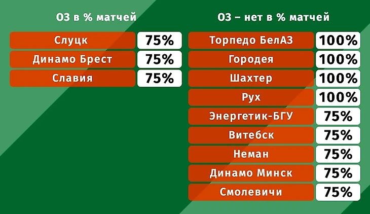 Как вы видите, здесь девять коллективов чаще играют на «нет». Восемь из них присутствуют в обеих нерезультативных частях таблицы. Собственно все, кроме «Смолевичи». А вот по тоталу больше совпадение только одно – та самая «Славия», спаситель результативности в Беларуси.