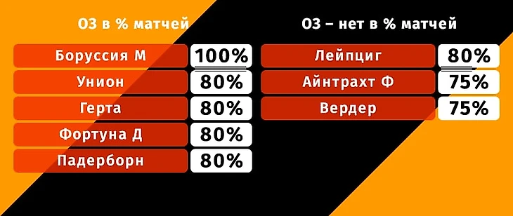 «Боруссия М», «Герта» и «Унион» попали в обе голевых таблицы. Еще один парадокс – «Айнтрахт Ф» за февраль-март провел все игры по тоталу больше, но ОЗ прошел всего один раз. «Падерборн» не так безнадежен, огрызается и забивает регулярно. Отдельно скажу, что «Бавария» тринадцать раз выигрывала первый тайм и матч, «Лейпциг» – двенадцать.