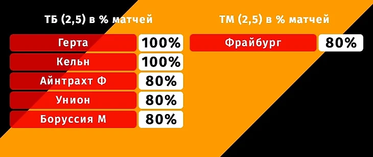 Естественно, больше команд с тенденцией верхового футбола. Если брать весь чемпионат, то «Бавария» и «Боруссия Д» сыграли по 21 матчу из 25 с тоталом больше. «Майнц» и «Герта» – по 19. Интересно, а есть ли они в трендах последних пяти туров, давайте проверим.