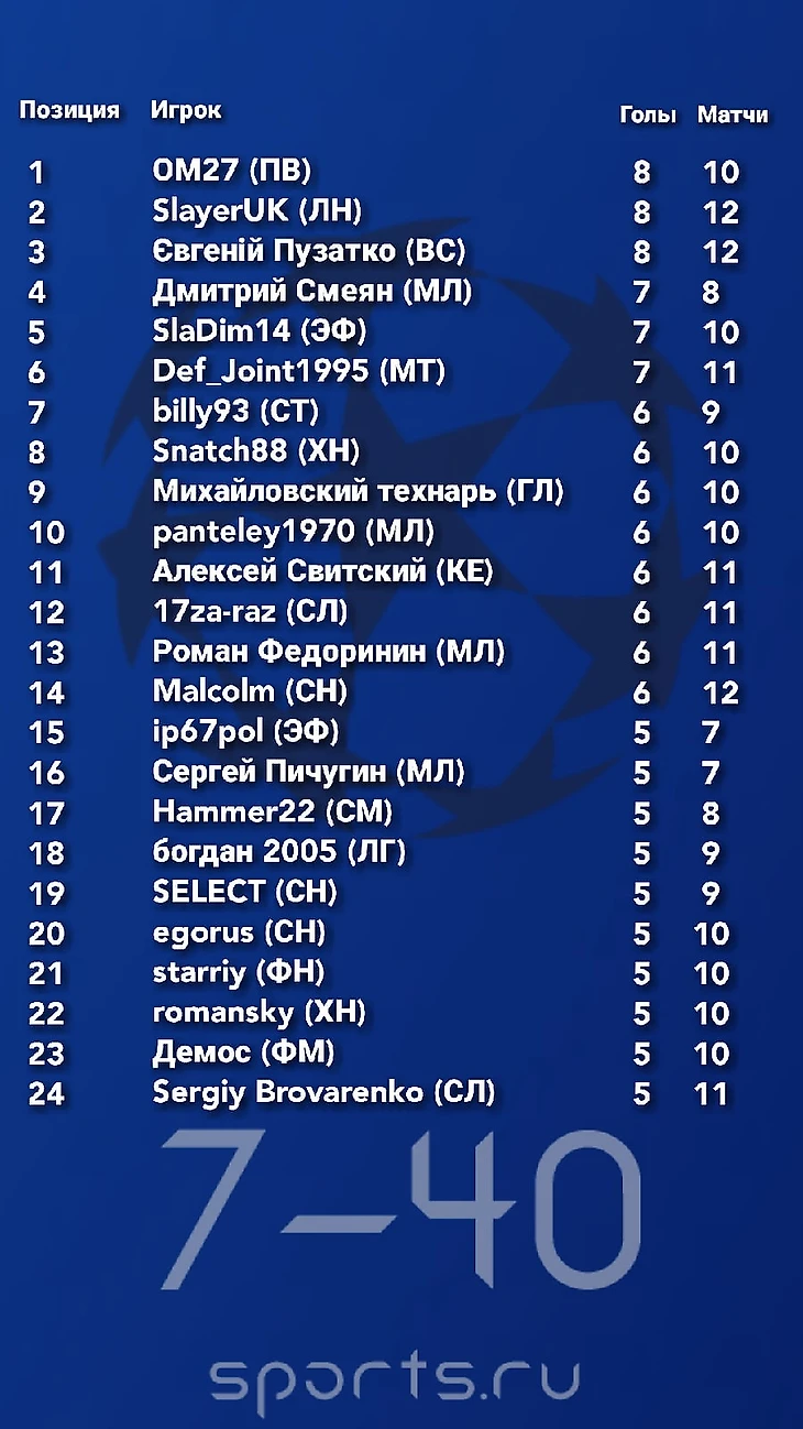 SlayerUK не только не забил, но и потерял лидерство в списке бомбардиров. По соотношению «голы-матчи» его догнал Євгеній Пузатко (Воины Света) и обогнал коуч-дебютант из Pro Vercelli ОМ27. На его счету 8 голов в 10 матчах.