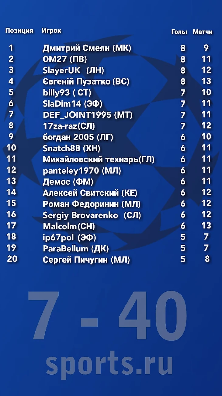 + Дмитрий Смеян, после неудачного первого тура, забил во всех 8 играх, в которых принимал участие