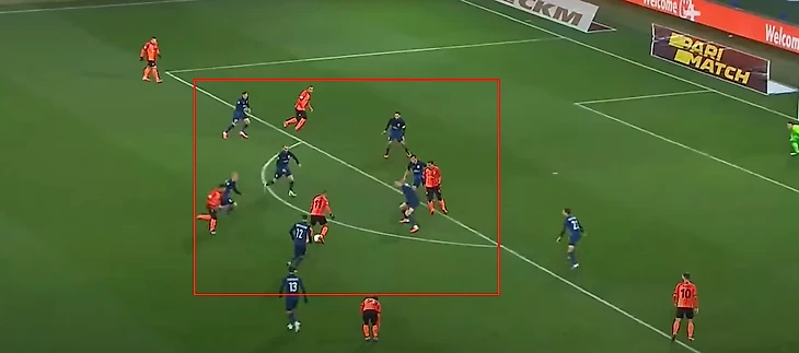 В защите они используют схему 4-4-1-1, где четверка полузащитников играет компактно возле штрафной, они не пытаются играть широко, понимая что фланговым игрокам Шахтера навешивать не на кого, а пространство для обыгрыша 1 в 1 им давать не нужно,