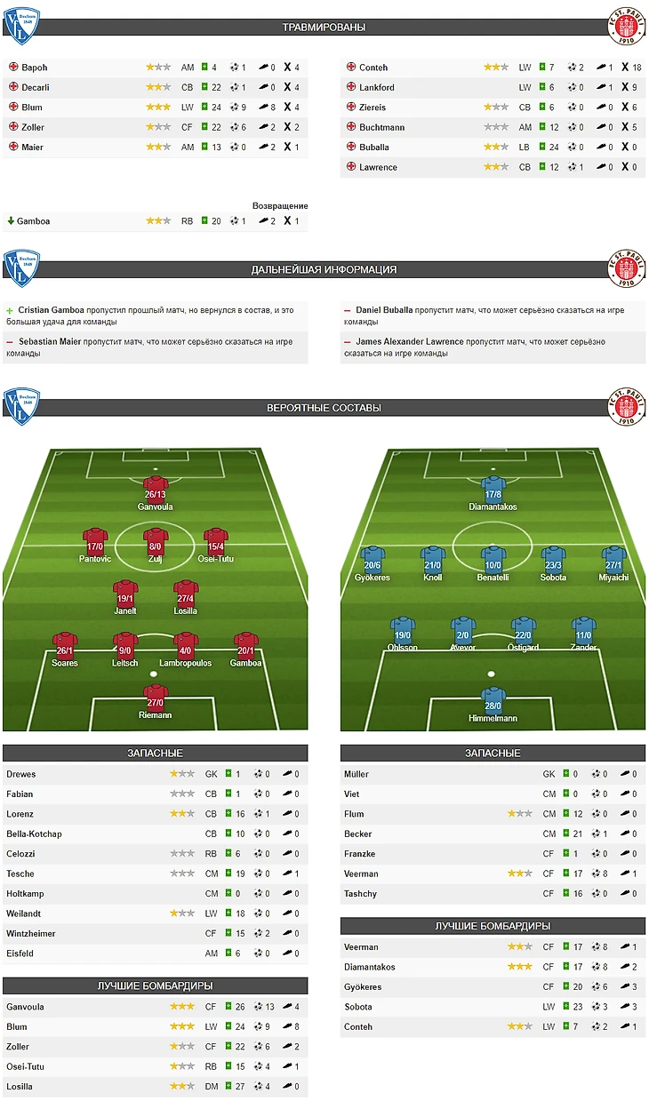 К радости футболеров из «Бохума», гости испытывают значительные кадровые проблемы в обороне. За «Санкт-Паули» сегодня не сыграет основной левый защитник Buballa (24 выхода на поле), а также центровой бек Lawrence (12 выходов). Первого, скорее всего, заменит полузащитник Ohlsson, а второго резервист Avevor (всего 2 выхода на поле). Если зыркнуть на лавку, то там и вовсе нет номинальных защитников. Смотрим, братья! 👇