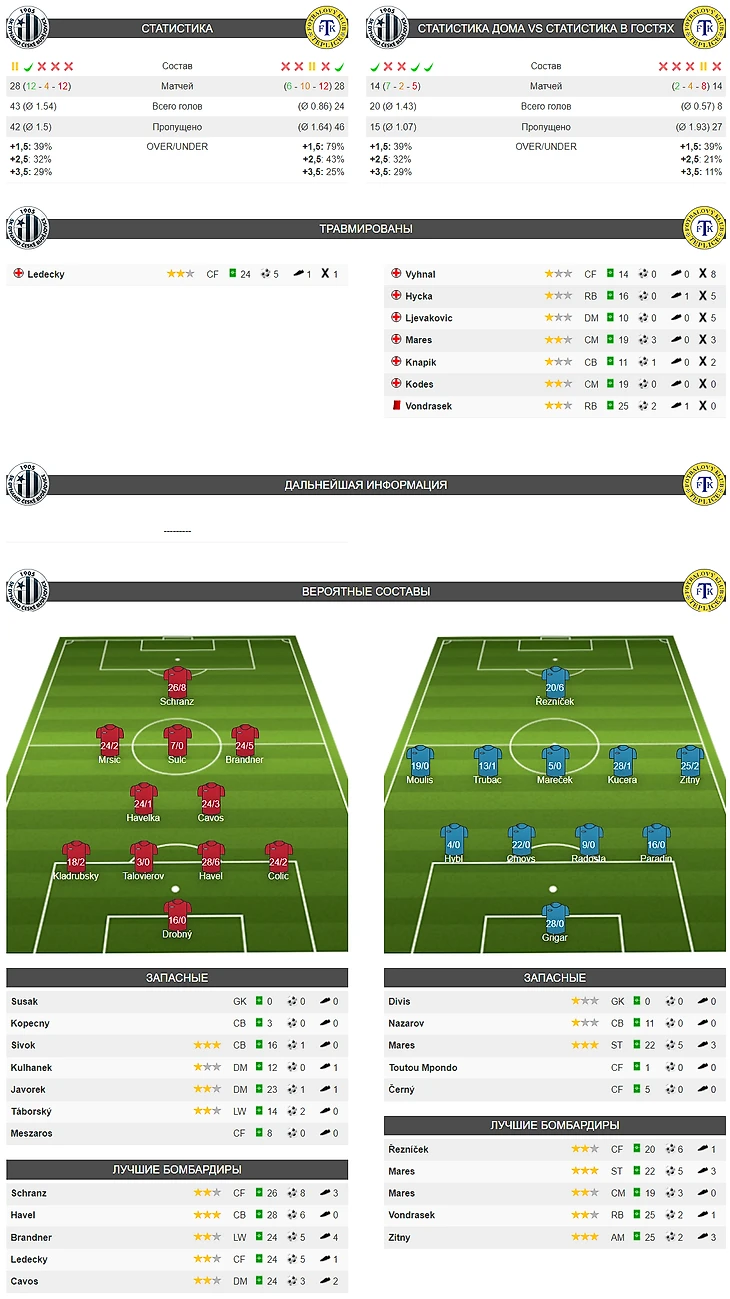 Целый ряд игроков гостей не примут участие в матче. Среди них — важный защитник Tomas Vondrasek и не менее важный полузащитник Petr Kodes. Обе потери значимые и свежие, но есть и у «Теплице» и другие проблемы:
