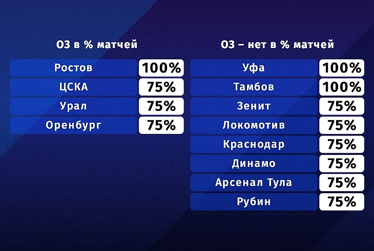 Кроме южан в правой части таблицы все те же команды: «Уфа», ЦСКА, «Рубин» и «Ахмат», на них даже не всегда дают стандартное значение в 2,5 гола (обычно 1,5 или 2). У грозненцев всего семь верховых игр из двадцати двух, у «Рубина» – шесть, у «Уфы» – пять. Что касается по трендам на «обе забьют», то здесь все намного интереснее и разнообразнее.