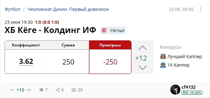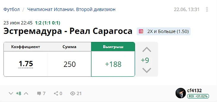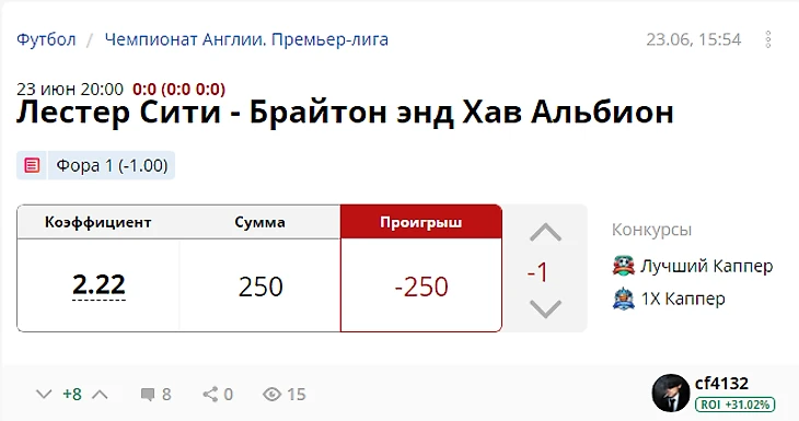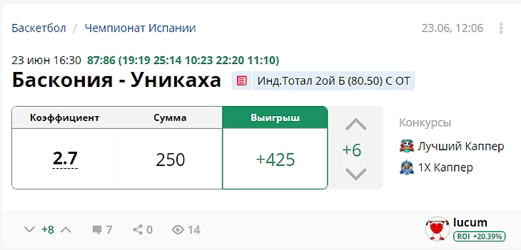 Результат с учетом ставок капперов: +475 рублей (ROI 32,75)