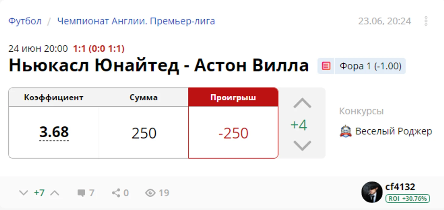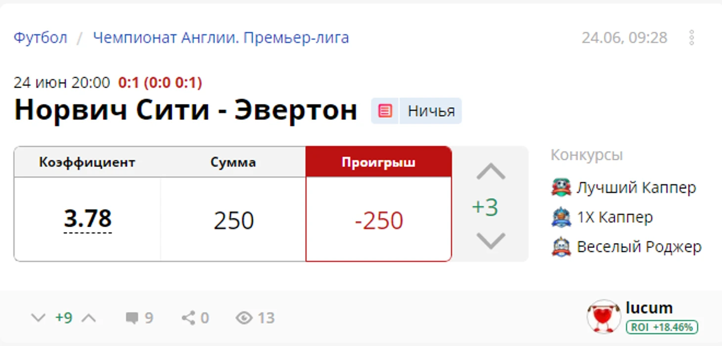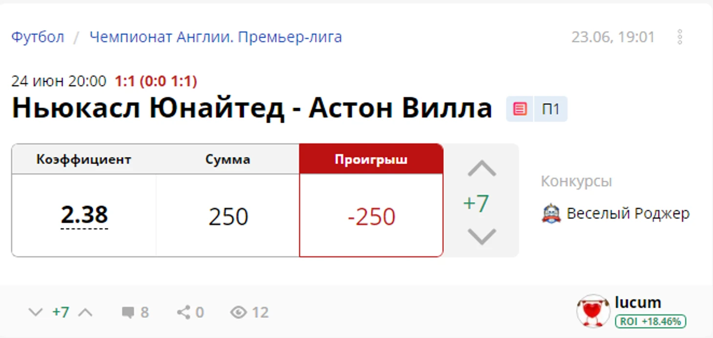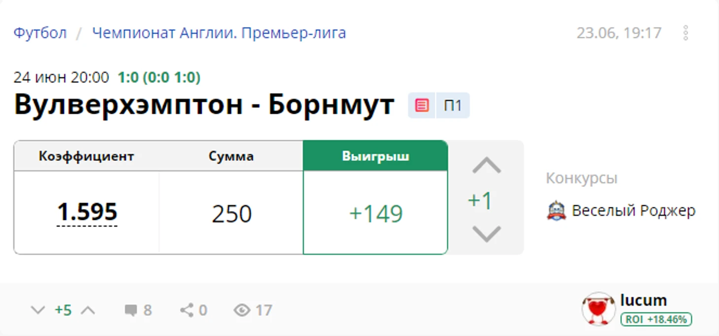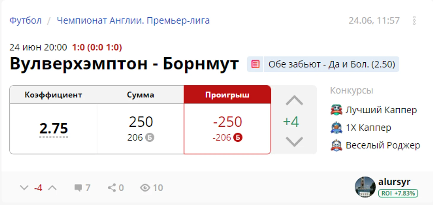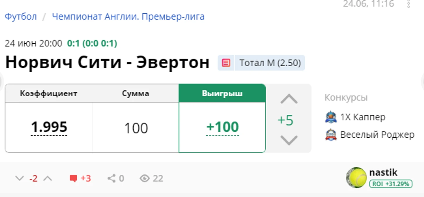 Результат с учетом ставок капперов: +93,75 рублей (ROI 5,85)