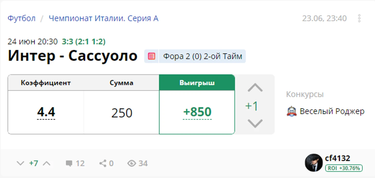 Результат с учетом ставок капперов: +475 рублей (ROI 32,75)