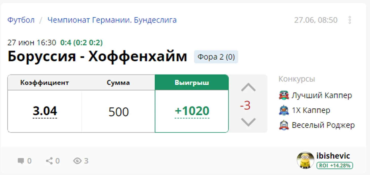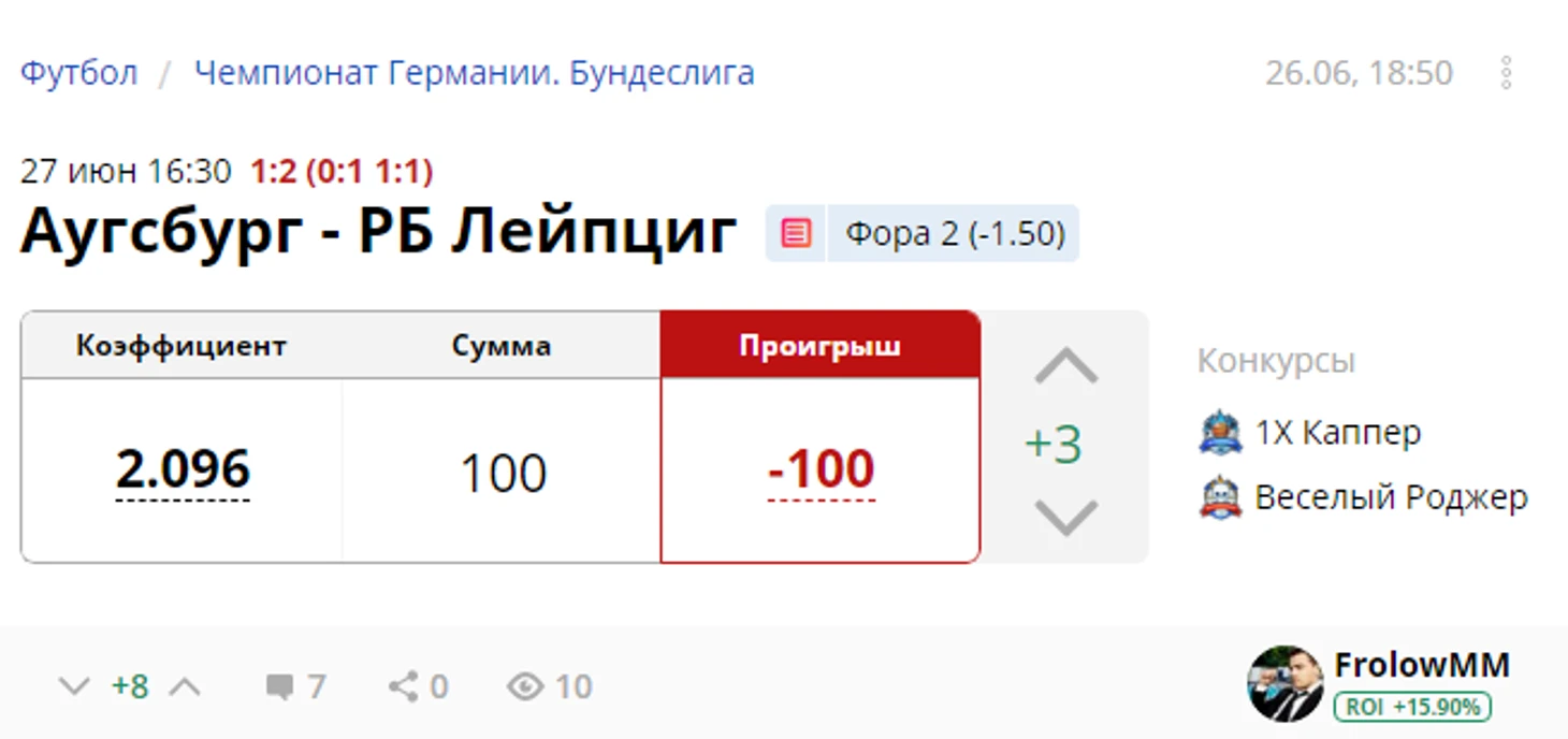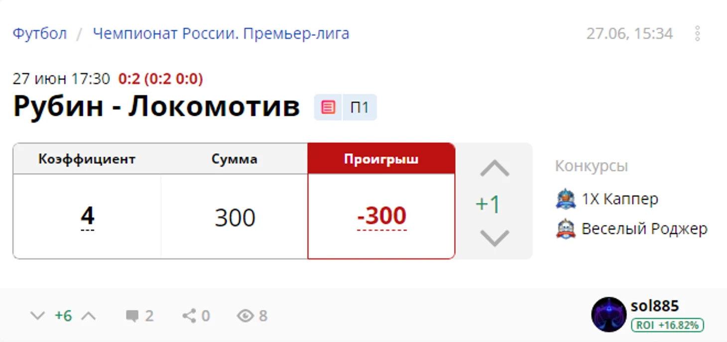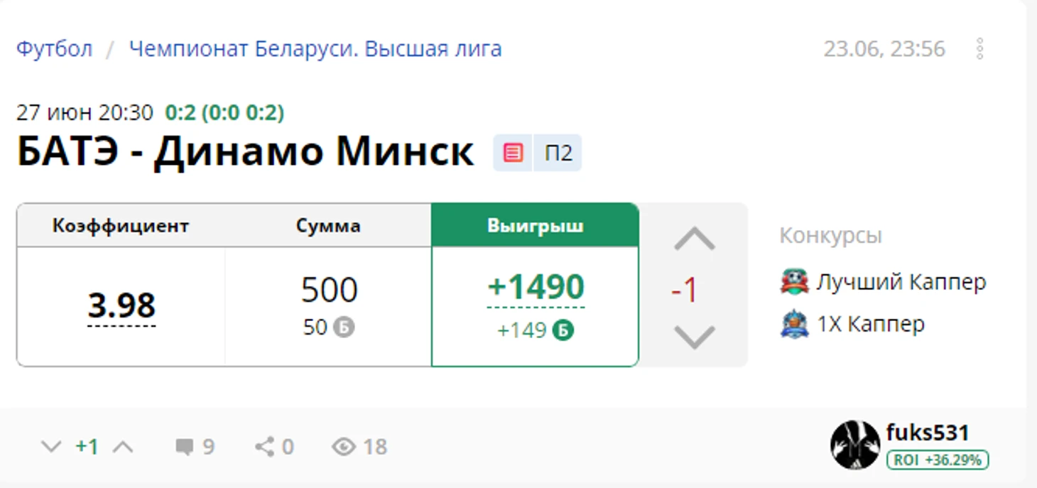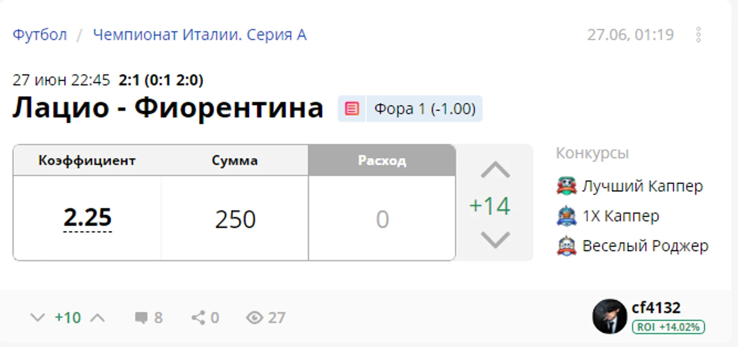 Результат с учетом ставок капперов: +1388 рублей (ROI 94,55)