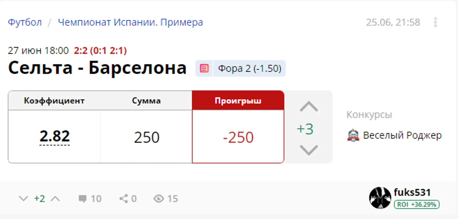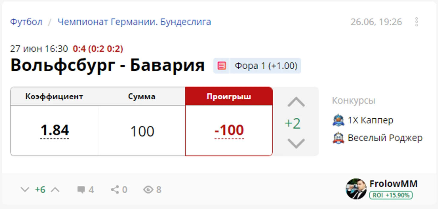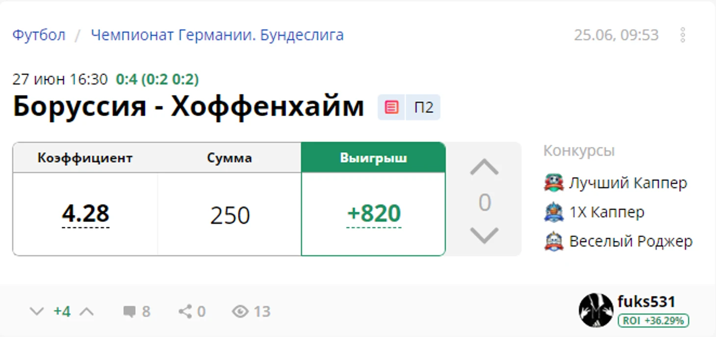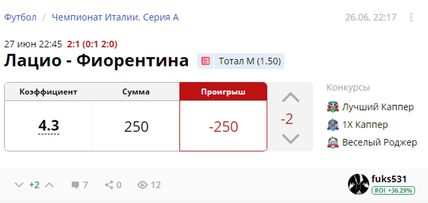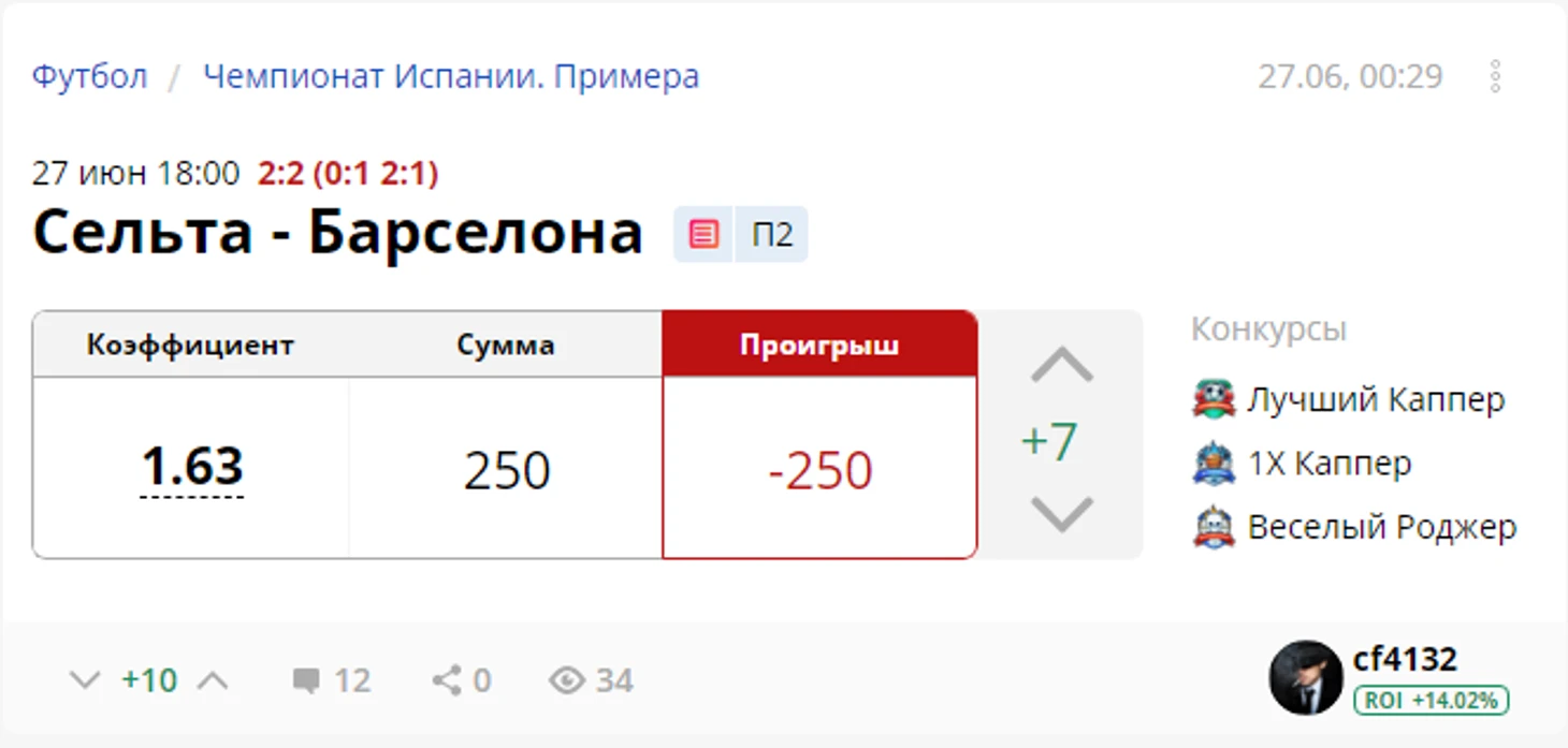 Результат с учетом ставок капперов: +1388 рублей (ROI 94,55)