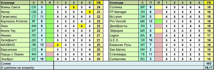 Один из самых ярких матчей тура вершит наш обзор. Здесь было максимальное количество свободных вариантов, как и в матче легионеров и мафиози (25). Итальянцы сыграли качественно, как и Максимус, которому жутко не повезло: наряду с Перцами с Пивом они стали лучшей по УВ командой средь проигравших (по 20), да и ещё уступили в матче, хоть и набрали на 2 УВ больше соперника.