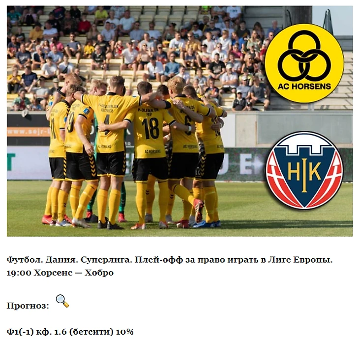 Хорсенс в великолепной форме. Команда не проигрывает 8 игр подряд в рамках Суперлиги. На этом отрезке были обыграны даже гранды — Мидтъюлланд, Копенгаген, Брондбю. Команда сейчас в прекрасном настроении + есть высокая мотивация в борьбе за Еврокубки.