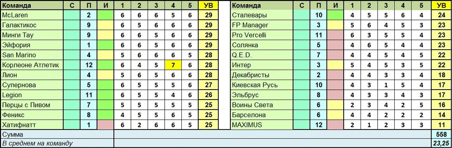 Лучшая команда тура по сумме УВ в целом: McLaren, Галактикос, Минги Тау, Эйфория – 29 вариантов