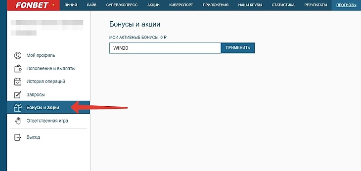 1. Войдите в Личный кабинет и активируйте промокод фонбет WIN20 в разделе «Бонусы».