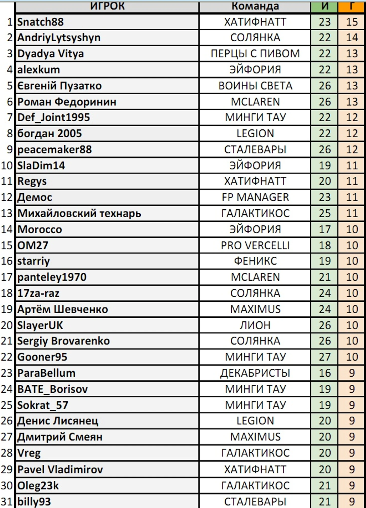 Отдельно я бы отметил в своей команде Андрея (AndriyLytsyshyn), новичок в игре просто разрывает в этом сезоне - забил 14 голов в 22 матчах и находится в топ-3 бомбардиров. Это ещё раз доказывает, что иногда лучше найти свежего, голодного игрока и развить его на максимум, чем брать опытных старожилов (хотя и те способны конечно тащить). Ну и вдруг кто уже положил глаз на Андрея - сразу напишу, что он не продаётся:)