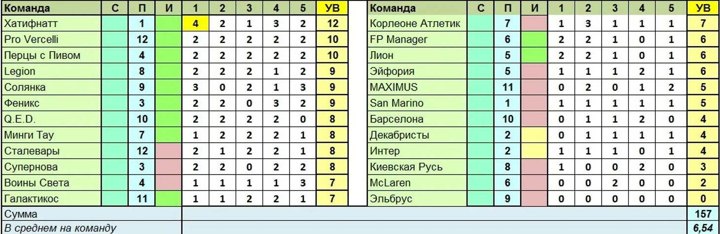 Удивительно лицезреть шотландцев в числе худших по Σ УВ, тем более, с четырьмя линиями без единого угаданного варианта. Похвалу заслужили в этот раз менеджеры, но отдельную – тренер маков Роман Федоринин, сражавшийся за честь своей команды и отстоявший её посредством вариантов 17 и 38.