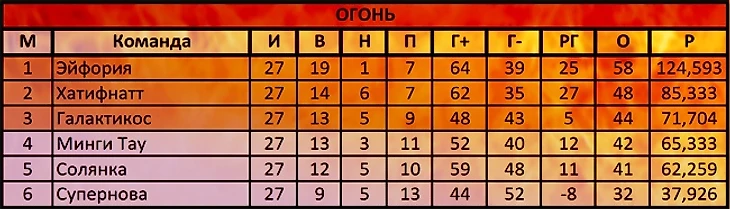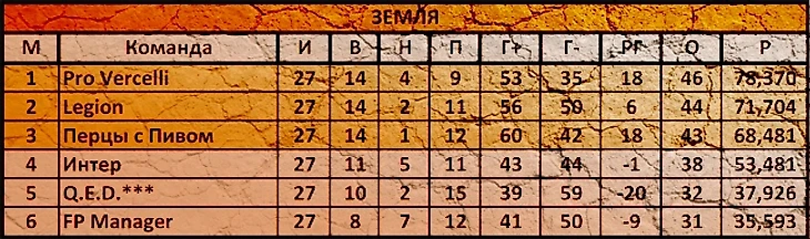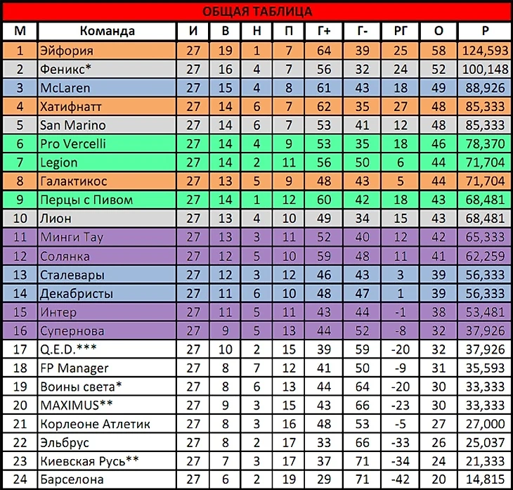 По такому МДП играть на 7 свободных вариантах – это испытание нервов на прочность. Четыре линии голов не принесли. Решала тренерская дуэль на 4-й линии, благодаря 9-му варианту, в ней победил Tasman, бывший в этом матче простым игроком, но всё же являющийся главным тренером, прошу не забывать об этом :) Я отдаю должное великолепно играющим в этом сезоне птицам огня и в то же время воздеваю руки к небесам: как же так, Супернова в стопятисотый раз набирает больше всех УВ среди проигравших!