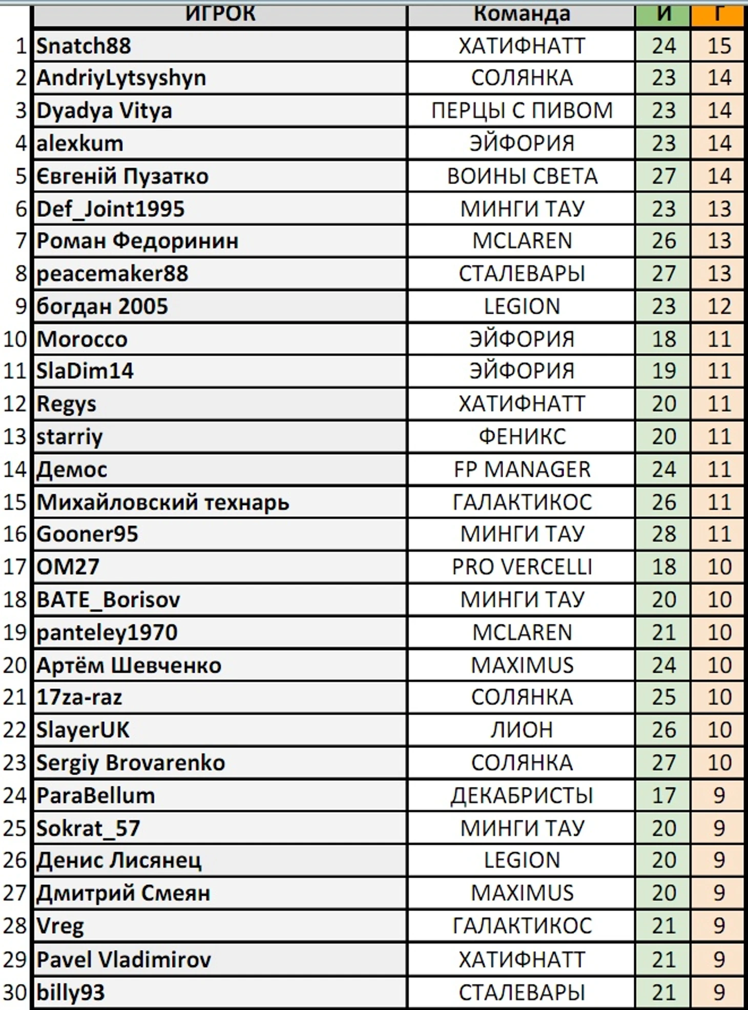 Эйфория тоже победила в обеих встречах (в матче 13-го тура со счётом 3:1). Сейчас они здорово попали в 22-й вариант, правда, и без него они победили бы галактическую сборную, набравшую всего 11 УВ (меньше всех сыгравших). В обоих турах за эйфов забивали Morocco, RobyIZ и alexkum.