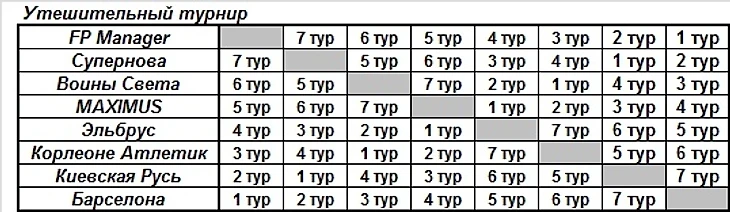 Прикладываем шахматку утешительного турнира и текущую его таблицу.