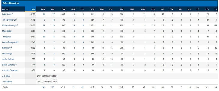 Отличную игру провел Порзингис. Поддержал Хардуэй ну и конечно же Трэй Берк (31 очко и 8/10 дальних). Лука по бросковой линии выступил слабо (1/9 с дуги и общие 40,7%), провалился Сет Карри (0/5 с игры). По темпу Даллас играл весело и всячески поддерживал темп Хьюстона. От этого 105 бросков (пусть и с овертаймом) и 107,77 владений за игру. Показатели эффективности атаки просто убийственные - 125,2 очка на 100 владений, в защите ужас – 128,4 пропущенных на 100 владений.