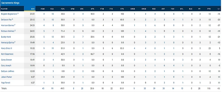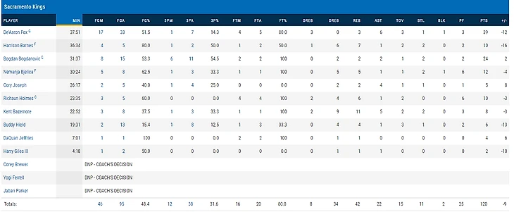 Сакраменто в первых двух играх пропустили 132 и 129 очка. Пропустили от Сан-Антонио и Орландо. Еще нужно что – то писать? Только в двух четвертях с восьми Кингз пропускали меньше 30 очков: вторая с СаС и четвертая ничего не решающая с Орландо. Просто ужас. При этом атака подопечных Уолтона работает достаточно хорошо: 120 и 116 набранных очка с показателями эффективности на уровне 111-111,5 очков на 100 владений. По темпу Сакраменто наконец – то начали бежать и показывают 107,5 владений с СаС (которые в пузыре тоже бегут) и 104,5 с Орландо что говорит о высоком темпе именно Сакраменто. Короли буквально заточены под быстрый темп. По-другому играть просто непростительно, когда в твоем ростере есть такие игроки как Хилд, Фокс, Богданович. Да и оба доступные на данный момент центровые команды Холмс и Джайлз активно бегут в атаку и поддерживают быстрые отрывы. Но защита! Защита Сакраменто по большому счету отсутствует как класс. Габаритов не хватает, да и желания умирать в защите нет. Ну и Уолтон вряд ли является тренером умеющим поставить защиту. Вот и получается Сакраменто играет в свое удовольствие, лидеры читерят статистику и не отрабатывают в защите. Кстати по лидерах. К Фоксу и Богдановичу вообще вопросов не может быть. А вот Бадди Хилд пока проваливает рестарт выдавая 2/13 с игры (1/8 дальних) против СаС и 5/13 (2/7 с дуги) против Орландо.