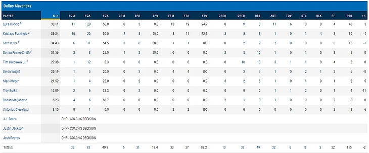 Провалился Хардуэй (0/8 дальних), Берк не блестал, Лука опять с дуги ничего не попал. Но зато Кристапс опять на высоте и хорошо сыграл Сет Карри (3/6 дальних и 20 очков). Система Карлайла работает очень эффективно в атаке. Несмотря на только 6/31 с дуги Даллас набрал 115 очков и показал в общем неплохую эффективность в атаке – 109,5 очков на 100 владений. В защите опять все не очень хорошо – 111,4 пропущенных, темп 105 владений. Ключевой в плане результата стала третья четверть в которой игроки Далласа ничего не попали: 0/9 с дуги и 5/21 с игры. Считаю такой показатель статистической аномалией. Итоговые 19 набранных очков и 36 пропущенных существенно усложнили задачу Маверикс.