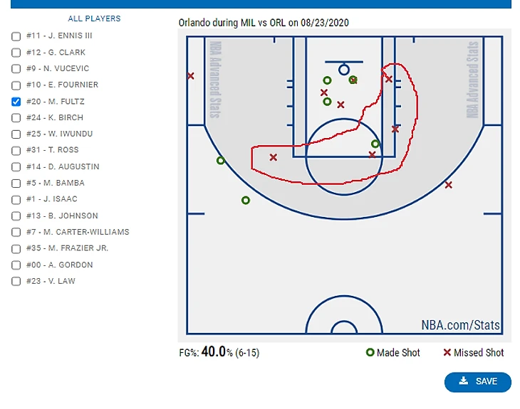 Целых 15 бросков. Бросковая линейка в плане эффективности конечно намного лучше, но каждый третий бросок все равно остался не самым эффективным (1/5 по таким броскам). Да и вообще молодой разыгрывающий взял на себя очень много бросков (больше только Вучевич – 20 попыток). Но если Вуч с 20 попыток набрал 31 очко, то Фульц набрал только 15 очков (1,55 очка на владения против 1 очка). К слову Фульц стал вторым худшим игроком команды по «+/-» с показателем -11.
