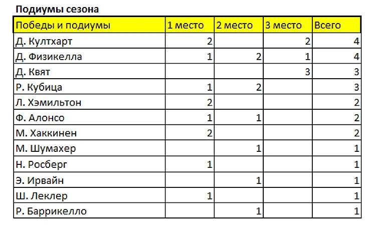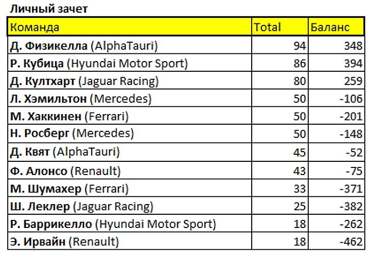 Победу в чемпионате первую для себя одержал Джанкарло Физикелла! Не без доли везения, как и в прошлом году Альфа Таури могла (а может и должна была?), слить остаток сезона и вылететь за пределы призов, но сумела зацепить подиум в последней гонке и воспользоваться подарками конкурентов!