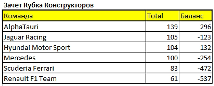 После перерыва связанного с пандемией короновируса, ситуация в чемпионате стала меняться. Лучше всего к рестарту подготовились команды Jaguar и Hyundai, на двоих собрав 8 подиумов из 5 оставшихся этапов! А Роберт Кубица пропустив первые 3 Этапа за оставшиеся 5 не только догнал лидеров, но и лидировал будучи главным претендентом на чемпионство! Но последняя гонка сезона, все расставила на свои места.