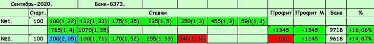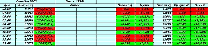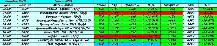 Суммарный банк составляет 38590, и за сентябрь увеличился на +6312, или 19,56%. "СТАВКА ДНЯ" на 14.09.20. АПЛ. Брайтон - Челси. ИТБ2(1,5) кф.-1,67 ставка-800. "Ставка №11." 1. РПЛ. Зенит - Арсенал. ИТБ1(1,5) кф.-1,4 2. Швеция. Кальмар - Норрчепинг. УГЛ. ТБ(8,5) кф.-1,49 3. РПЛ. Ростов - Локомотив. ТБ(1,5) кф.-1,35 Общий кэф.-2,82 ставка - 1000. Друзья, не забывайте заглядывать в Телегу!!!! Там Вы сможете быстрей всего получить ставки. Особенно это актуально для "лесенок", которые проходят в лайве, и время на принятия ставок бывает ограниченно. Желаю всем профитных ставок и отличного настроения!!!!