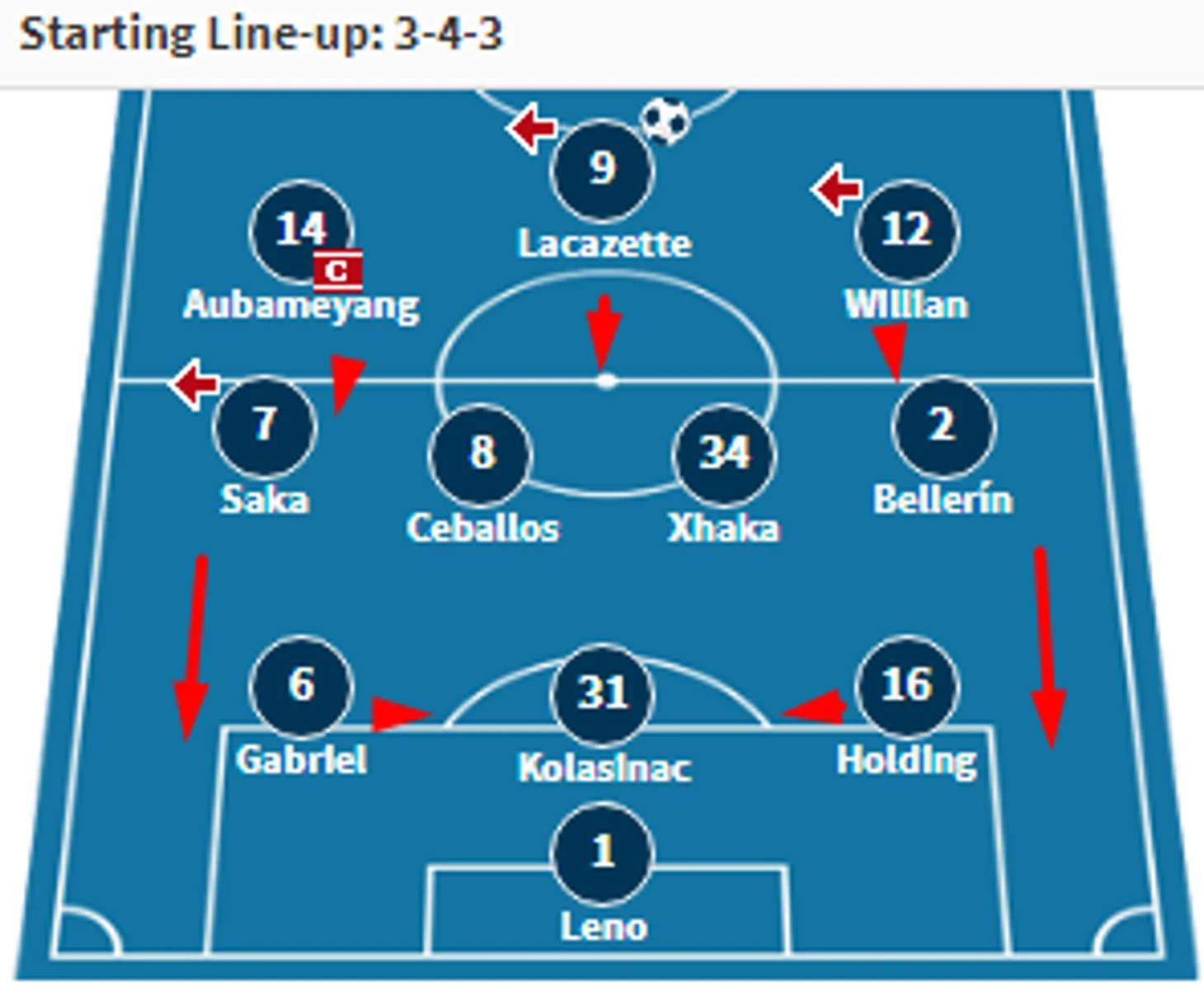 При игре в атаке это 3-4-3, при игре в защите это 5-4-1, где Сака и Бельерин падают на края защиты, а тройка Габриэль, Давид Луиз и Тирни (вероятно сегодня) играют в центре защиты. Себальос и Джака в центре, а Обамеянг и Виллиан садятся на края полузащиты, Ляказетт же прессингует высоко. Чертовски крутая схема за счет одного - абсолютно все игроки задействованы в прессинге, то, чего раньше у Арсенала не было.