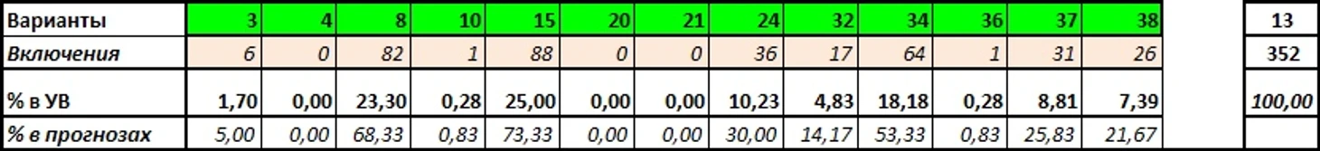 На широких 20 вариантах произошло интересное соперничество. Хатифнатт трижды угадал ЖК и не был плох по Σ УВ, но проиграл набравшей ход и на 2 УВ больше Барселоне, взявшей такие варианты как 3, 32, 36, 37, 38, и пока имеет всего лишь один балл.