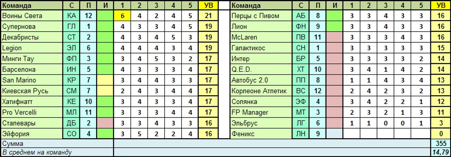 В этой битве за шесть очков блестяще проявили себя Воины Света, ставшие лидерами по Σ УВ. Разнообразные варианты в улове у хозяев (среди них 6, 11, 22, 29 и 36), а вот у корлеонцев скромнее: 6, 15 и 36. Yura Kilb и вовсе мог взять 7 УВ, да не хватило одной лишь ЖК, хотя вначале график набора командами горчичников был хороший.