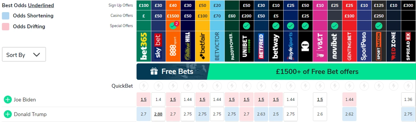 Дональд Трамп за месяц до выборов берет и заболевает коронавирусом. После чего БК остановили ставки на выборы и закрыли все линии. Позднее, котировки вернулись, но уже с явным фаворитом в гонке. И фаворит этот – Джо Байден. Такие совершенно глупые коэффициенты я могу объяснить так: аналитики и трейдеры, узнав, что Трамп заболел, сразу же полетели вливать свои тысячи «зеленых» на Байдена, тем самым обрушив рынок. Мотивация? Возможное отсутствие Трампа в выборах или в предвыборной кампании. Слабая кампания могла бы сильно повлиять на рейтинг Трампа перед 3-м ноября.