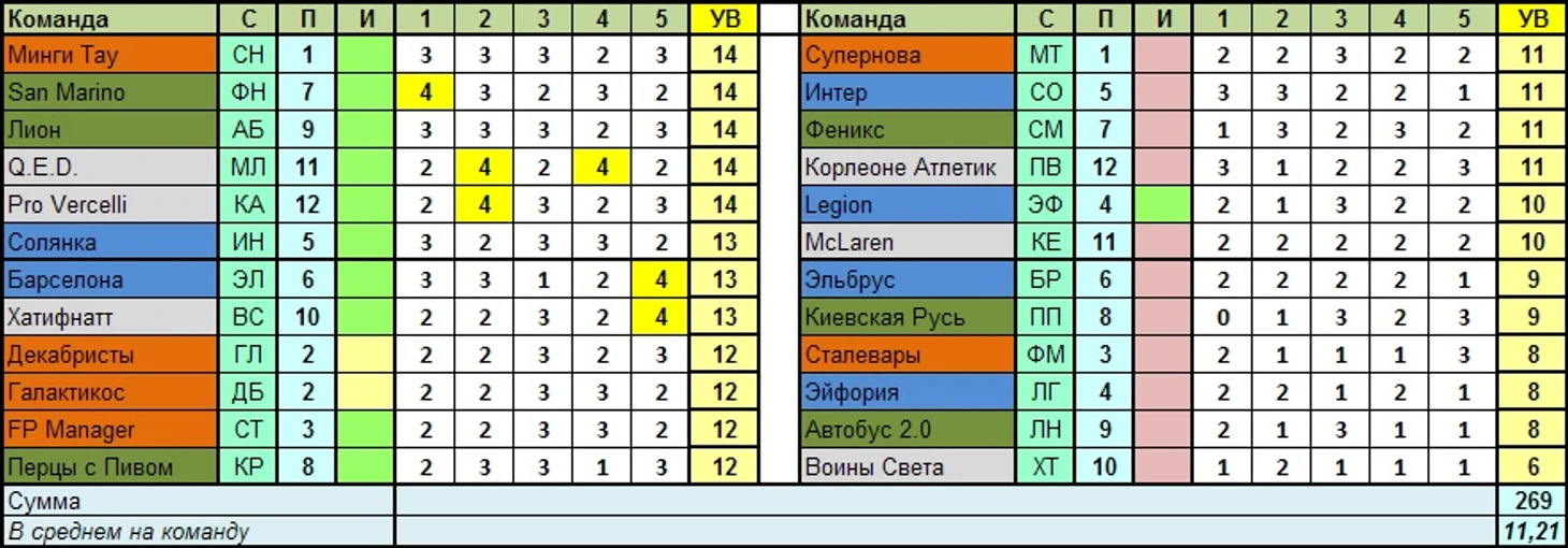 Лучшая команда тура по сумме УВ в целом: Q.E.D., Лион, Минги Тау, Pro Vercelli, San Marino – 14 вариантов