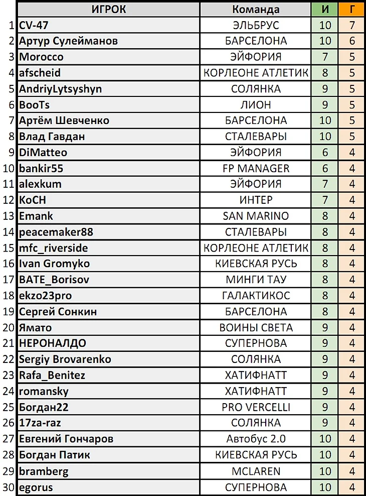 Лучший игрок тура по УВ: Константин Кужалевич (Барселона), Destro, ShinaYar (оба – Q.E.D.), Богдан22 (Pro Vercelli), alexkondr (San Marino), Rafa_Benitez (Хатифнатт) – 4 варианта