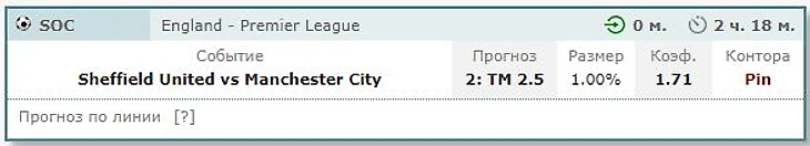 (+) Шеффилд - Ман. Сити, Ман. Сити тотал меньше 2.5 (1.71) Pin
