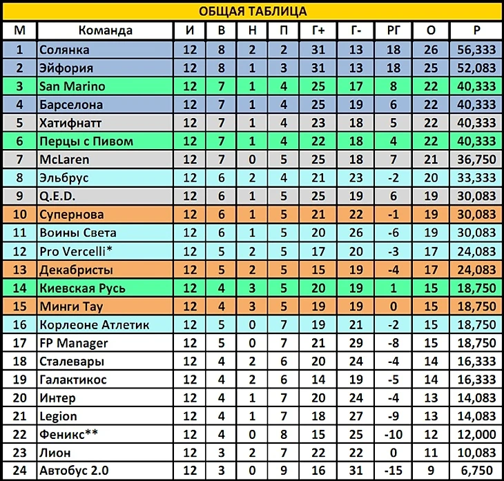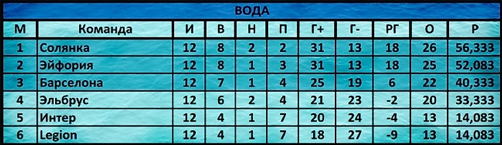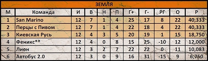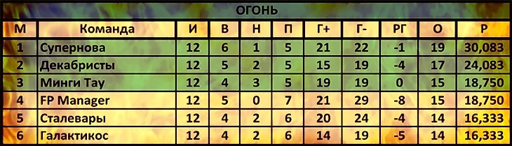 Пока худший – Дивизон Огонь, если бы не неявка Верчелли, эта группа была бы худшей по УВ. В пользу этого свидетельствует отрицательная или нулевая разница голов у всех шести команд;