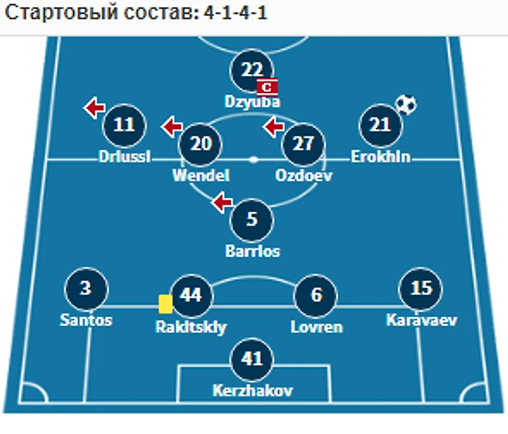 С ней они проиграли Рубину, и сыграли вничью со Спартаком, обыграв всего лишь Сочи. Состав следует ожидать весьма неоднозначный, Ерохин, Кузяев, Вендел, Оздоев, и Барриос. Остальные позиции без изменений. Как я выше сказал не будет Азмуна, а так же Малькольма, Дриусси и Мусаева.