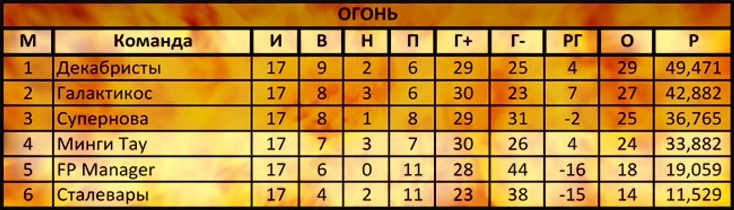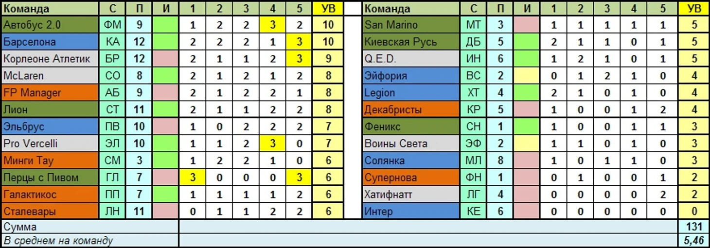 Коротко: Автобус 2.0 победил с подзабытым счётом 3:1. Последний раз этот счёт в матчах с его участием проходил в шестом туре, это пятый подобный результат в матчах с его участием. Всего шестеро участников набрали 3 УВ, только в одной команде (Перцы с Пивом) было два таких игрока, представители Барселоны и Корлеоне Атлетик, набравшие столько, сошлись на пятой линии между собой.