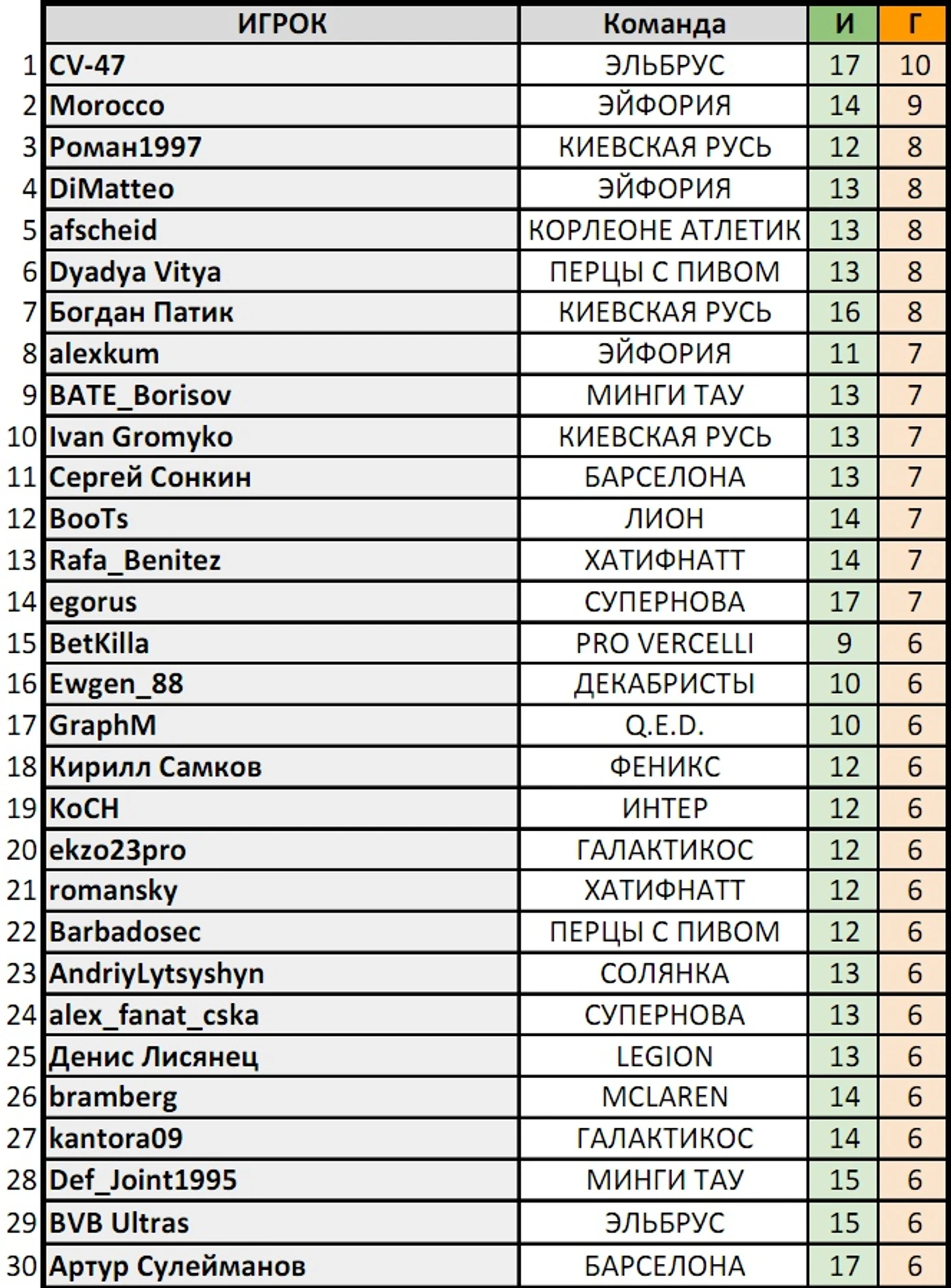 Лучший игрок тура по УВ: Мурад Буза (Автобус 2.0), Константин Кужалевич (Барселона), Виталий Колосов (Корлеоне Атлетик), Barbadosec, Dyadya Vityа (оба – Перцы с Пивом), MIRON 1982 (Pro Vercelli) – 3 варианта