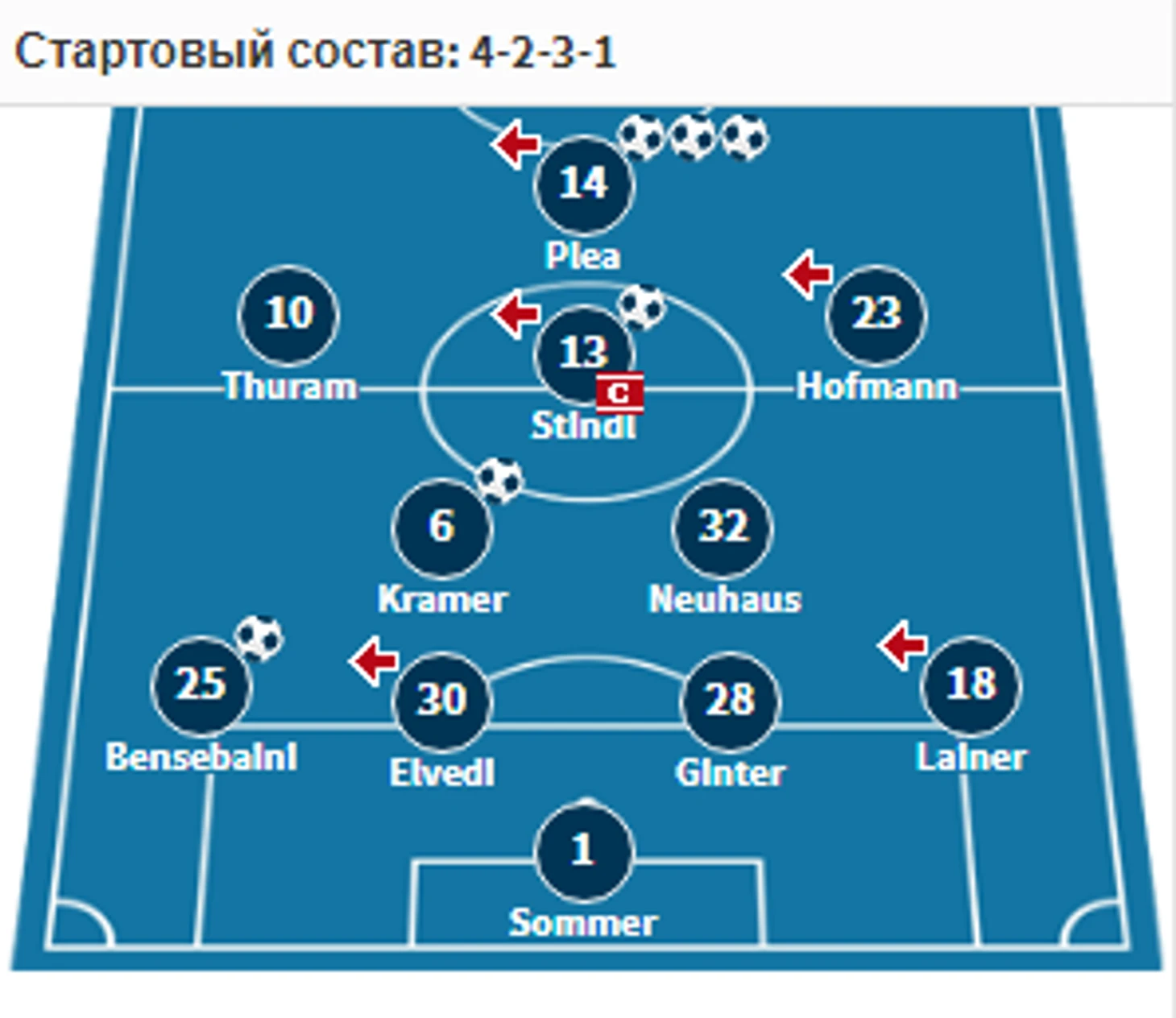 Плеа вероятно заменит Эмболо, Хоффмана на правом фланге заменит Лазаро. Остальные позиции вероятно без изменений.