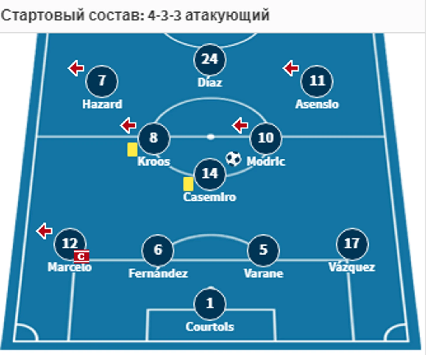 У Реала тоже неожиданностей немного, Васкез и Менди на флангах, Варан и Начо в центре, я напомню что Рамос не сыграет. Каземиро и Кросс в центре, и думаю Модрич. На флангах Родриго и Жуниор, Бензема на острие.