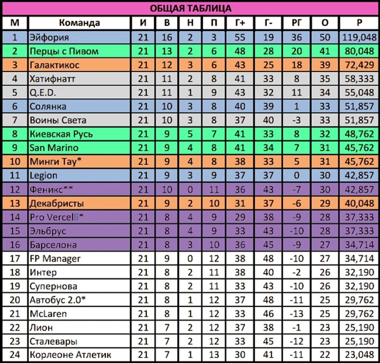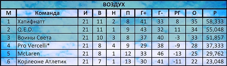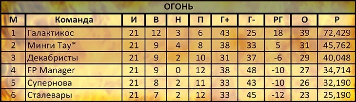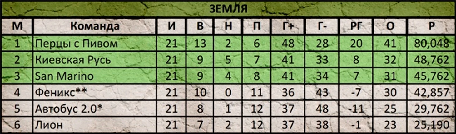 Все коллеги снизу выиграли. Возвращаемся на землю. Борьба за верхние строчки общей турнирной таблицы — не наш нынешний уровень. Но класса КР должно хватить для того, чтобы мы заранее решили вопрос выхода в плей-офф. Поздравляем Перцев с, пожалуй, уже победой в нашей группе. Сан-Марино, Феникс, Автобус и Лион призываем выдать огненную концовку сезона в нашем секстете! Но в матчах с нами можете чуточку поддаваться... :)